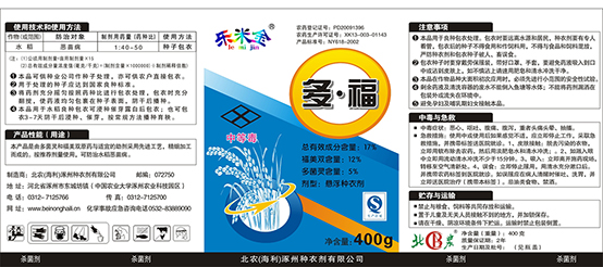 北農(海利)涿州種衣劑有限公司是由中國農業大學與湖南海利化工股份有限公司于19984月合資成立的有限責任公司。公司主要從事懸浮種衣劑、干粉種衣劑、懸浮劑、可濕性粉劑、水乳劑等農藥的研發、生產和銷售。